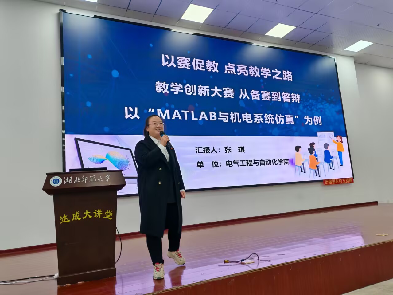 随后,第四届湖北省高校教师教学创新大赛新工科中级及以下组二等奖获得者张琪老师以“湖北省教创赛备赛策略分享——从选题到答辩”为题,并结合她主持获批的省级一流课程《MATLAB与机电系统仿真》为例,全面分享了教创赛的参赛经历与思考。报告围绕挑战与机遇、大赛背景、实施方案和备赛建议四个方面展开,并提出科研反哺教学和备赛融入日常两条建议。