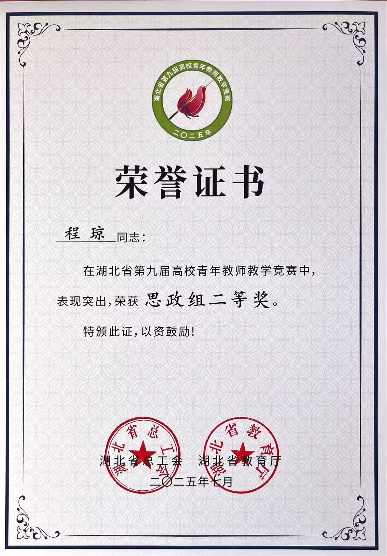 2025年7月10日至11日,湖北省第九届高校青年教师教学竞赛决赛在中国地质大学(武汉)举行。此次青教赛由省总工会、省教育厅主办,省教科文卫体工会、省教育厅教师管理处承办。决赛设置教师教学设计、课堂教学及教学反思三部分内容,并分成文科、理科、工科、医科、思政等5个专项组开展教学竞赛。我校马克思主义学院青年教师程琼、文学院青年教师沈月从全省54所高校的145名优秀青年教师代表中脱颖而出,分别荣获思政组二等奖和文科组三等奖。